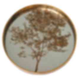 Kolla in denna vackra bricka, som ger en finstämd lyx därhemma! Golden bricka är i spegelglas och har ett motiv av ett graciöst träd. Glaset reflekterar rummets ljus på ett vackert sätt. Runt brickan finns en kant av mässingsfärgad metall. Brickan är rund och är 46 cm i diameter.