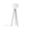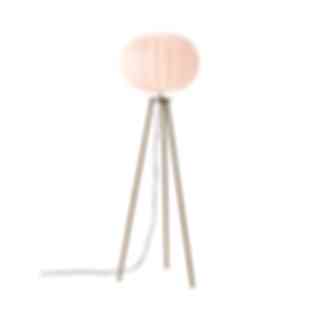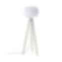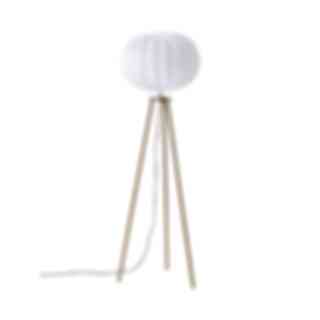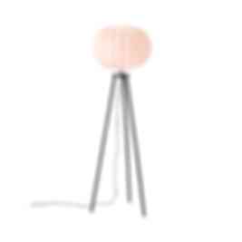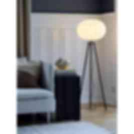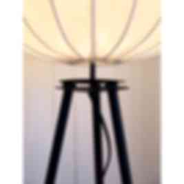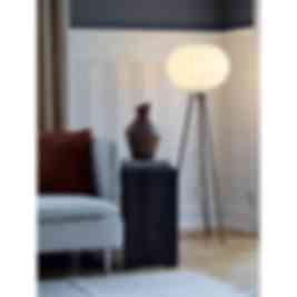 Golvlampan Base, trebent golvlampa i metall, så kallat stativ, med vit Hilma lampskärm i bomull. Lampskärmen är 40 cm i diameter. Finns i finslagen råborstad antik mässing och mattsvart.