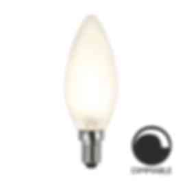 Frostad E14 LED, dimmerkompatibel. Ljuskällan ger ett varmvitt ljus och lämpar sig väl inuti en lampskärm gjord av textil eller i t.ex. vita glaskupor. Den är CE-märkt.