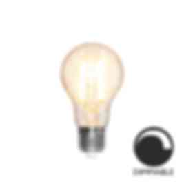 Klar E27 LED Filament, dimmerkompatibel. Ljuskällan ger ett varmvitt ljus och lämpar sig väl i t.ex. textilskärmar och större klara glaskupor då den lyser starkt. Den är CE-märkt.