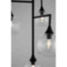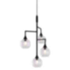 Denna enkla och stilrena lampa med fyra stycken munblåsta kupor i klart glas blir en fin detalj ovanför t.ex. ett matbord. Glaskuporna skruvas fast på den mattsvarta metallställningen med de medföljande skärmringarna. Lampan har en 120 cm lång svart textilkabel med svart takkopp, kronkoppling för takanslutning medföljer ej.