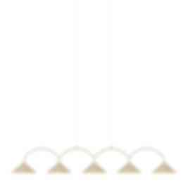 Curve 5 är resultatet av en lek med geometriska former där de mjuka rundade bågarna möter de skarpa triangulära linjerna på skärmarna. Denna lampa passar utmärkt att hänga över matsalsbordet såväl som ovanför köksön. Denna lampa är tillverkad av mattlackerad metall med fem stycken metallskärmar samt två stycken 200 cm långa vita textilkablar med en matchande takkopp i metall. Kronkoppling för takanslutning medföljer ej. Curve finns i beige och svart färg.