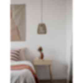 Saigon, en lampskärm i konstrotting. Konstrotting är ett tåligt material som klarar väder och vind. Den flätade strukturen skapar ett vackert ljusspel. Takskärmen säljs tillsammans med ett svart takupphäng för inomhus bruk. Lampans bredd och djup är 18 cm och höjden är 20 cm. 1,2m med E27 lamphållare och takkopp för krokupphäng. Max 40W. IP20. Ljuskälla och takkontakt ingår ej.