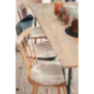 En ovadderad stolsdyna i mjukt korthårigt fårskinn med ursprung ifrån Australien samt en undersida i ofärgat läder.