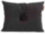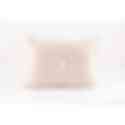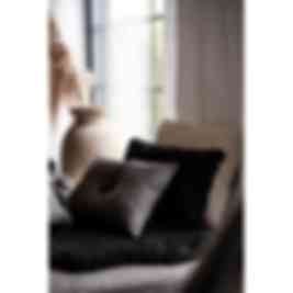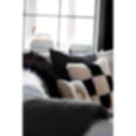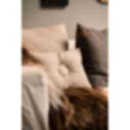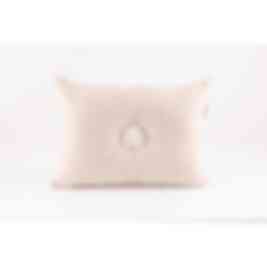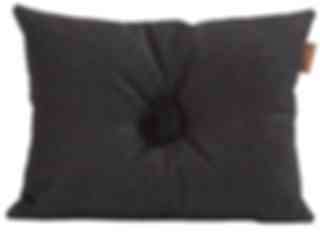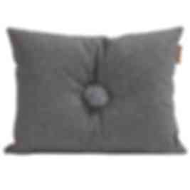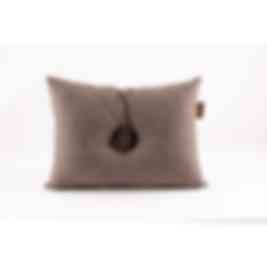 En kudde i mjuk vävd ull med en dekorativ knapp i fårskinn och en fyllning i polyester.