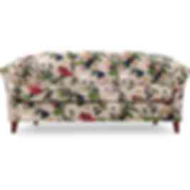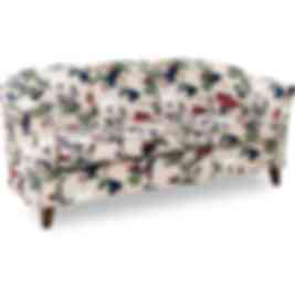 Soffan är klädd i tyg Gripsholm, som är ett klassiskt, omtyckt, mönstrat tyg. Det har liv och frodighet med sina blad, blommor och frukter! Tyget är slitstarkt i 100% bomull, tillverkat av Borås Cotton.