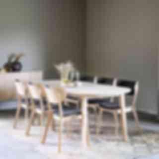Kato är en tidlös stol att älska länge. Den har eleganta linjer och en smäcker form. Det är en riktigt stabil stol och passar lika bra till matbordet som för sig själv. Sitsen är stoppad och skön. Stolen är tillverkad i vitpigmenterad ek.