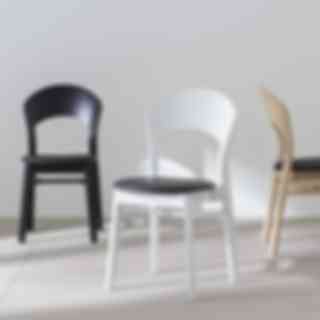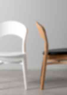 Rainbow stol i vitlack. Stolen finns i olika färg och material och kombineras med valfri sits i bonded läder eller textil. Tillverkad av Hans K.