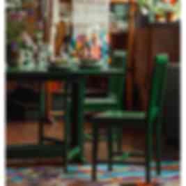 Karin ritade alla möblerna som fanns i familjens matsal, vilka sedan byns snickare Arnbom tillverkade. Karin designade bland annat matbord, stol och vitrinskåp. Hon ritade, vävde och borderade egna textilier. Hela den uttrycksfulla och omfamnande matsalen inredde Karin som en överraskning till Carl. Familjen invigde matsalen på Carls namnsdag och då började man använda stolarna. Det är utifrån ritning av dessa stolar som du nu kan köpa.