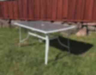 Stilsäkert bord i vit lackad aluminium med grå toppskiva i glas. I bordet finns hål för möjlighet till att ha parasoll.