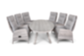 Coventry är matgruppen för dig som vill ha den exklusiva, lyxiga och sköna komforten. Matgruppen i konstrotting består av stort härligt, elipsformat bord 220 x 120 cm med tempererad glasskiva. 6 stycken recliner fåtöljer som steglöst kan ställas efter önskad lutning och armstöden är rundade i bakkant. Tjocka, sköna dynor i olefintyg ingår.