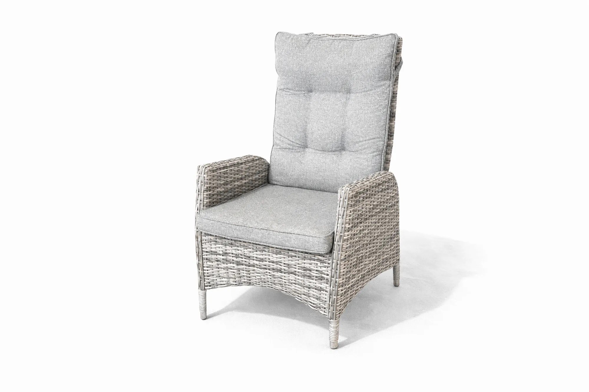 Vår lyxigaste och skönaste fåtölj. denna exklusiva steglöst ställbara fåtöljen är flätad i antracit grå konstrotting. De tjocka, mjuka tillhörande dynorna i mörkgrå olefintyg ingår.