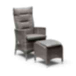 Elegant, nätt, steglöst ställbar, recliner fåtölj med tillhörande fotpall. Flätad konstrotting i färgerna antracit, pearl grey och white grey. Tillhörande dynor i olefintyg finns i ljus eller mörkgrå.