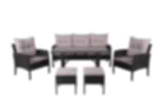 Här får du en 3-sits soffa, 2 fåtöljer samt 2 pallar som går utmärkt att använda som extra sittplatser.
