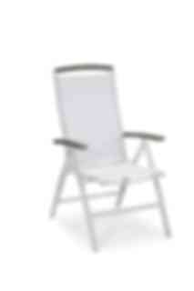 Gruppen Nydala, 4 stycken fällbara positionsfåtöljer samt bord med iläggsskivor i bordet. Vit lackad aluminium med Gaumo detaljer som ger en mjuk, inbjudande matgrupp att samlas vid.