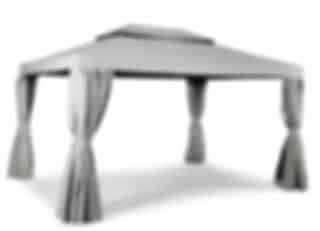 Klassisk paviljong i aluminium med tältduk i ljusgrå eller beige polyester, 4 x 3 meter som dekorativt ramar in uteplatsen. Paviljongen säljs som solskydd och levereras komplett med stomme, tak, väggar och myggnät. Det går att bara använda taket utan väggar. Helt efter önskemål kan en, två, tre eller alla fyra väggar användas. Eller bara myggnätet helt enkelt. Allt vad som passar just er.