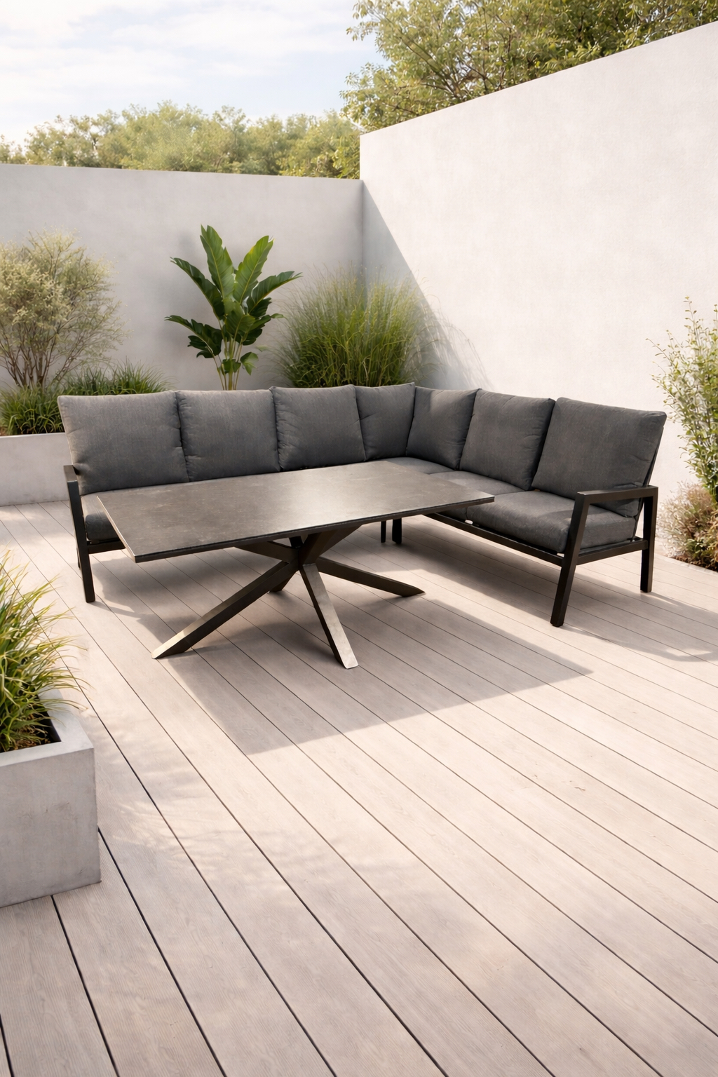 Hörnsoffa Lugano 3h2 i mörkgrå aluminium ink dynor och bord.