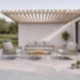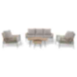 Soffan tillsammans med fåtöljer erbjuder generöst med sittplatser och inbjudande miljö. De bekväma dynorna ge hög komfort, samtidigt som de svepade armstöden i trä tillför en varm och ombonad känsla. De matchade borden med ribbad träskiva förstärker den naturliga känslan och skapar en perfekt balans mellan funktion och design.