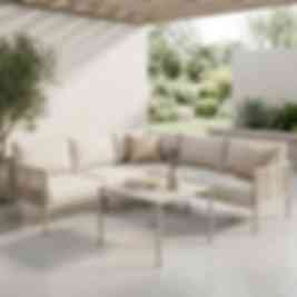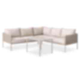 Soffan är uppbyggd i en praktisk hörnkombination som ger gott om plats och bjuder in till sociala stunder. De generösa sittdynorna skapar en bekväm sittplats oavsett en lugn stund i solen eller umgänge med familj och vänner. Kombinationen av aluminiumstomme, rope-detaljer och slitstarkt olefintyg gör soffgruppen både lättskött och anpassad för utomhusbruk. Det medföljande bordet kompletterar gruppen och skapar en naturlig uteplats.
