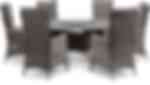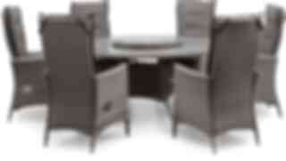 Konstrotting grupp i antracit eller pearl grey. Runt bord, 135 cm i diameter med tempererad glasskiva samt snurrbricka Lazy susan som går att lyfta av. 6 stycken steglösa, ställbara, recliner fåtöljer med tillhörande dynor. Ljus eller mörkgrå i olefintyg.