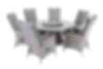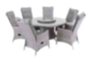 Härligt, stor, matgrupp i flätad konstrotting. Finns i färgerna antracit och pearl grey. Bord hela 150 cm i diameter med en tempererad glasskiva, en snurrbricka, Lazy susan som går att lyfta av ingår. 6 stycken steglösa, ställbara, recliner fåtöljer med tillhörande dynor. Ljus eller mörkgrå i olefintyg.