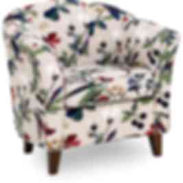 Fåtöljen är klädd i tyg Gripsholm, som är ett klassiskt, omtyckt, mönstrat tyg. Det har liv och frodighet med sina blad, blommor och frukter! Det är ett slitstarkt tyg i 100% bomull, tillverkat av Borås Cotton. Sittkomforten i Ekerö fåtölj är fast och stabil.