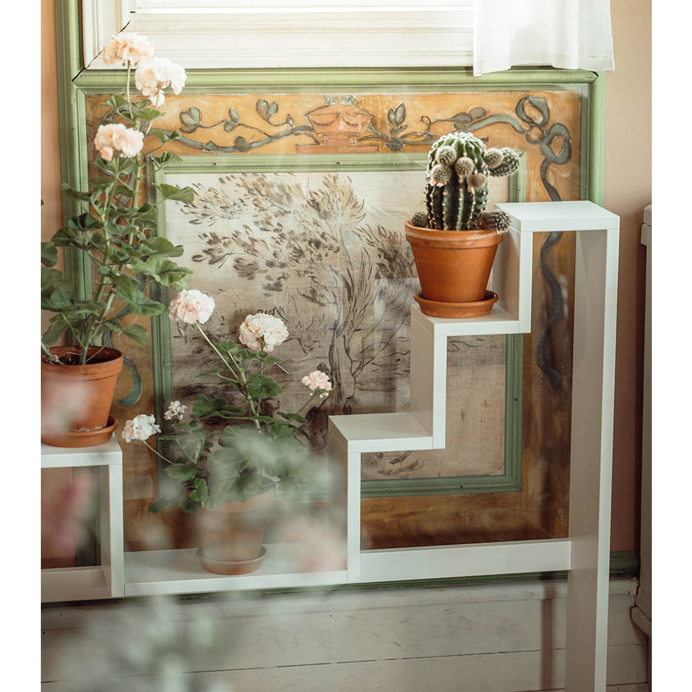 Karin Larsson designade blomsterhyllan för familjens blommor. Den var fiffig på det sättet, att den gav plats till många blommor, men ändå släppte in ljus från fönstret i rummet. Den trappstegsformade blomsterhyllan är funktionalistiskt formgiven av Karin Larsson och har en stram, tydlig design. Hyllan har ett monumentalt uttryck och är vacker som ett konstverk i sig, men förstås förträfflig att placera vackra ting, böcker eller blommor på.