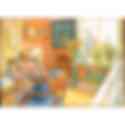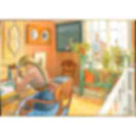 I skrivhörnan finns Karin egenritade gröna blomsterhylla, som tillverkades av Sundborns snickare Arnbom. Målningen du ser i bildspelet är en akvarell av Carl Larsson och heter "Brevskrivning". Här ser vi Ingrid, dotter till en av Karin och Carls anställda, som skriver brev bredvid blomsterhyllan där yviga pelargoner badar i ljus.