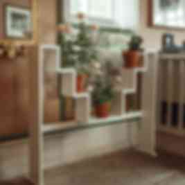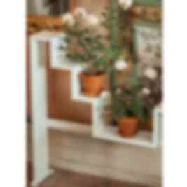 Karin Larsson designade blomsterhyllan för familjens blommor. Den var fiffig på det sättet, att den gav plats till många blommor, men ändå släppte in ljus från fönstret i rummet. Den trappstegsformade blomsterhyllan är funktionalistiskt formgiven och har en stram, tydlig design. Hyllan har ett monumentalt uttryck och är vacker som ett konstverk i sig, men förstås förträfflig att placera vackra ting, böcker eller blommor på.