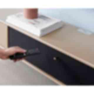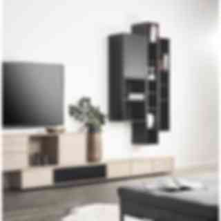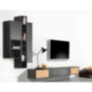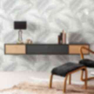 Mistral, en svävande mediabänk i ek och antracitgrå. En elegant nutida klassisk stil som kan passa in i de flesta rum. Dessa produkter framställs av 70% återvunnet material och från närområdet.