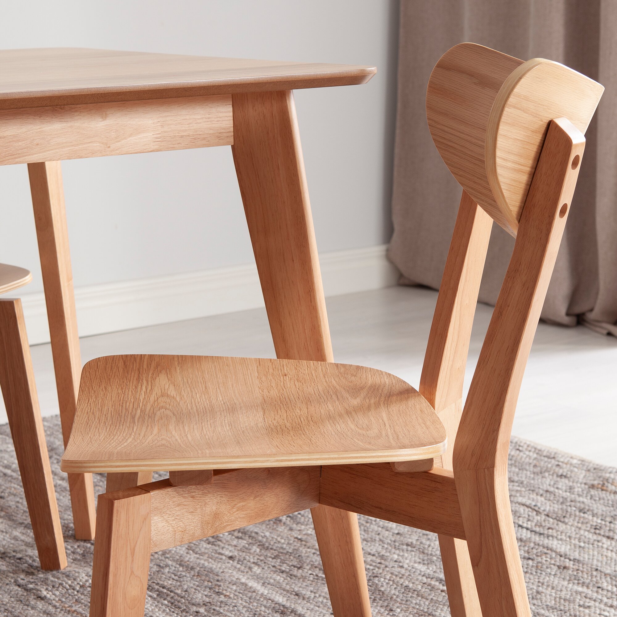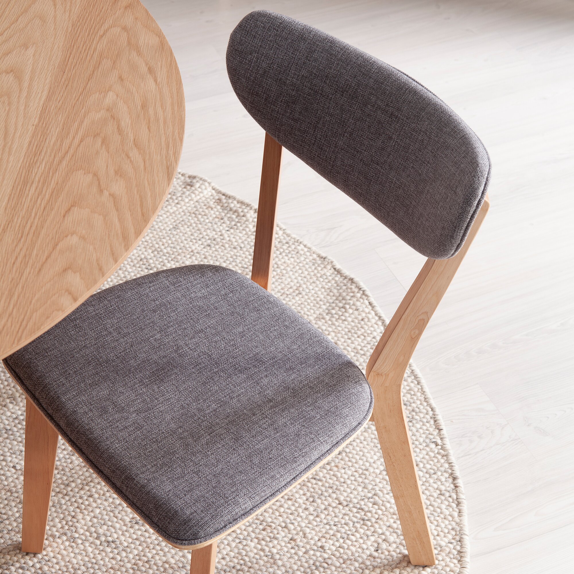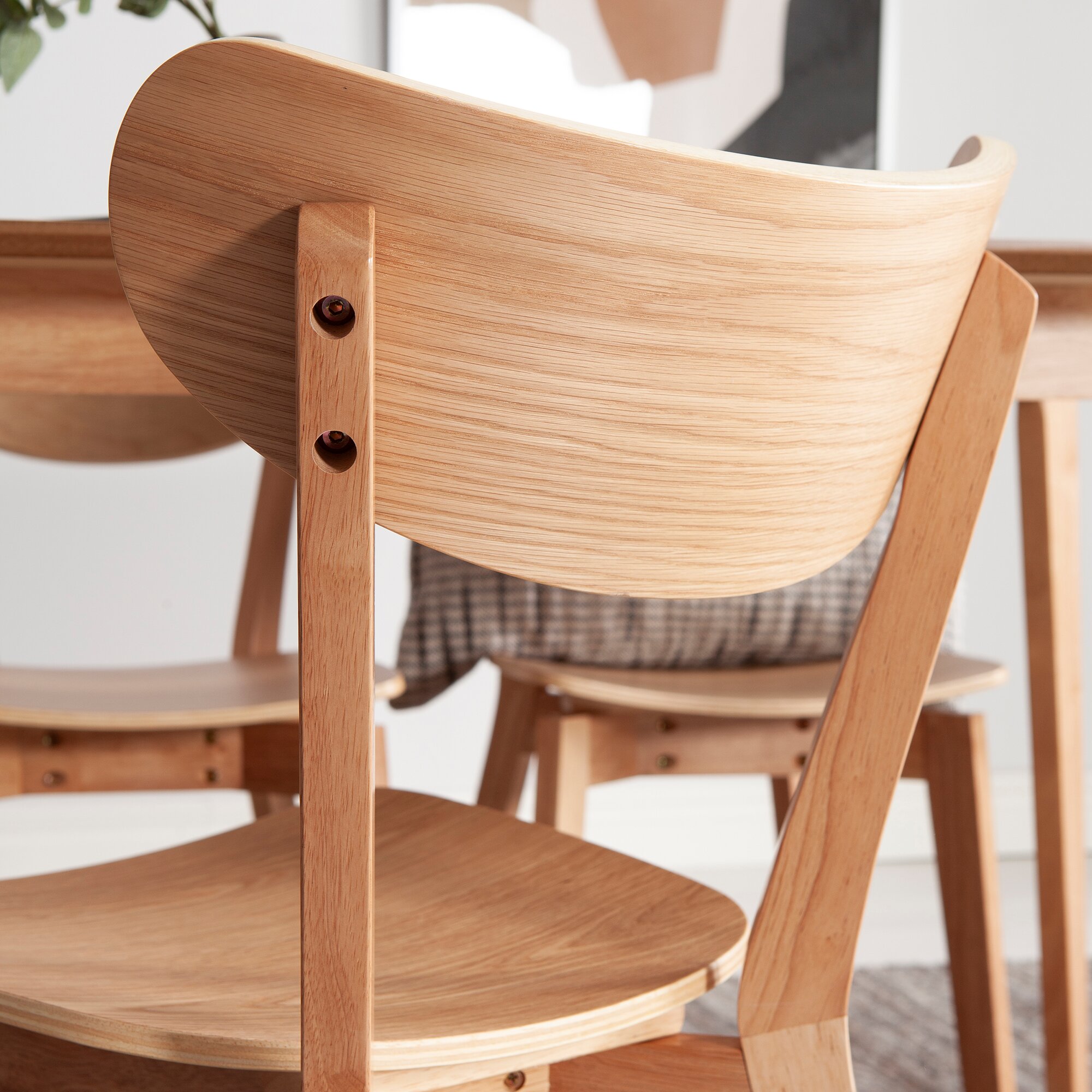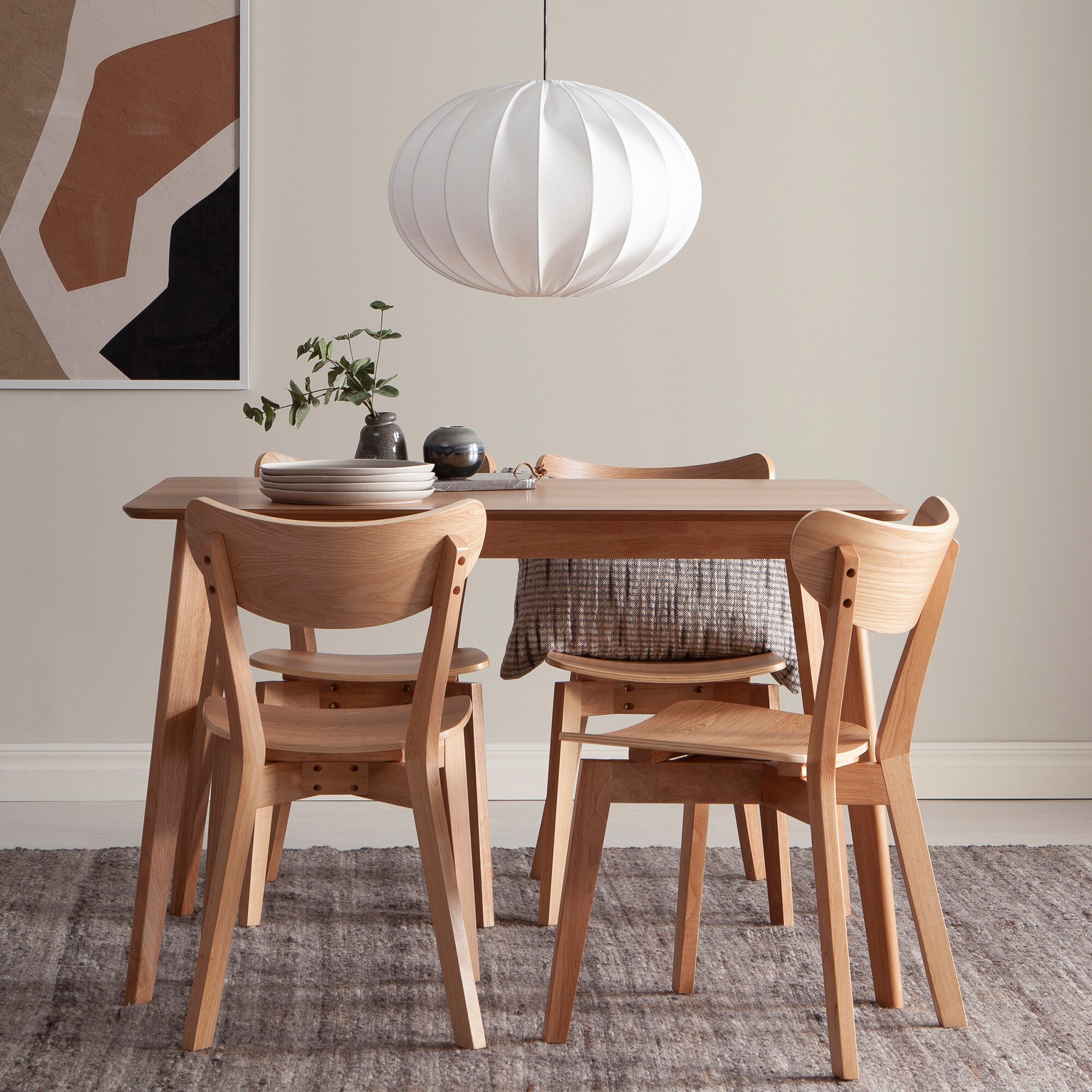 Den klassiska varianten med träsits har ett naturligt uttryck och framhäver ekträets värme. Vill du ha en mjukare känsla finns Yoko stol även med klädd sits i tyg, som tillför extra komfort och en inbjudande look. Båda varianterna är tillverkade med samma omsorg, med ben i ekbetsat gummiträ och sits i lackad ekfanér.