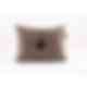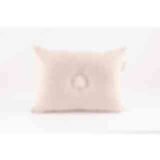 En kudde i mjuk vävd ull med en dekorativ knapp i fårskinn och en fyllning i polyester.